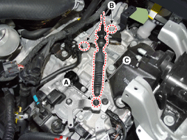Снимите кронштейн тяги ролика (C) после удаления болтов (A) и (B).