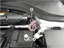Отсоедините отрицательный (-) кабель аккумуляторной батареи, отвернув болты (B).