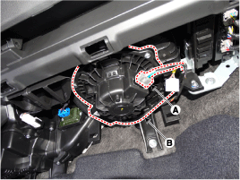 Отсоедините разъем электровентилятора (A), а затем снимите электродвигатель вентилятора (B), ослабив винты.