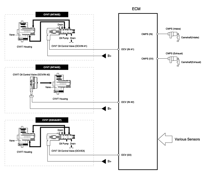 Система непрерывного изменения фаз газораспределения (CVVT) опережает или задерживает фазы газораспределения впускного и выпускного клапанов в соответствии с управляющим сигналом ECM, который рассчитывается по частоте вращения двигателя и нагрузка.