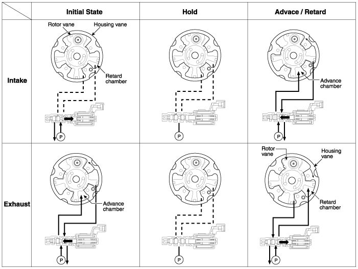 Моторное масло, вытекающее из клапана управления маслом CVVT изменяет фазу кулачка в направлении (опережение впуска/запаздывание выпуска) или направление, противоположное двигателю (замедление впуска/опережение выпуска) вращение за счет вращения ротора, соединенного с распределительным валом внутри кулачковый фазер.