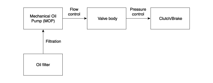 Масляный насос приводится в действие двигателем. ATF проходит через масляный фильтр и распределяется по масляным каналам.