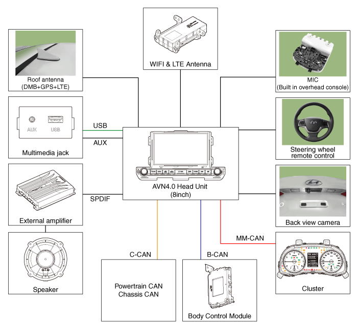 1. Головное устройство AVN4.0 (8 дюймов)2. Клавиатура Bluelink [4,0 (8 дюймов)]3. Внешний усилитель [4,0 (8 дюймов)]4. Антенна на крыше5. Мультимедийный разъем6. Антенна Wif и LTE [4,0 (8 дюймов)]7. Стери ...