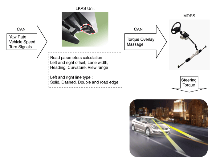 Hyundai Elantra: LKAS (Система помощи при удержании полосы движения) / Описание и работа