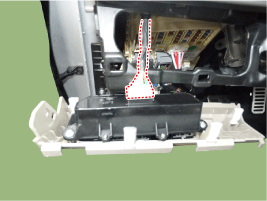 Снимите модуль подушки безопасности водителя, вставив плоский инструмент (05 мм) в направляющее отверстие, а затем нажмите на пружину.