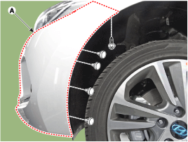 Ослабив штифтовые фиксаторы и винты сбоку переднего бампера (А), снимите боковую часть переднего бампера.