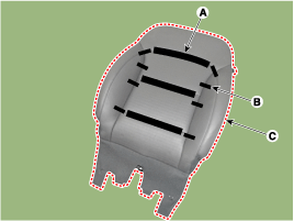 Удалив застежку-липучку (A) и кольцевые зажимы (B) с внутренней стороны обивки спинки переднего сиденья, снимите обивку спинки сиденья (C).