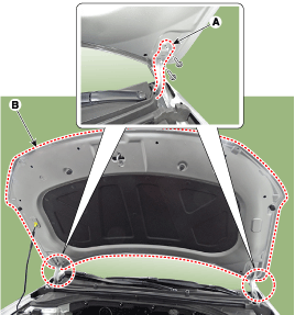 Ослабив болты крепления петли капота (А), снимите капот в сборе (В).