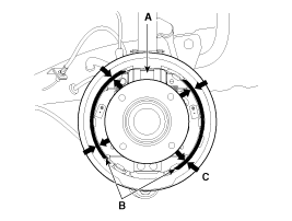 Измерьте толщину тормозной накладки (C). Измерение не включает толщину тормозной колодки.