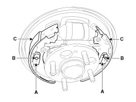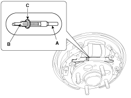 Установите тормозные колодки (С) на опорную пластину. Будьте осторожны, чтобы не повредить пылезащитные крышки колесных цилиндров.