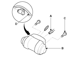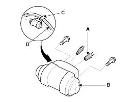 Нанесите герметик (C) между колесным цилиндром (B) и опорной пластиной (D) и установите колесный цилиндр.