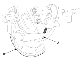 Отсоедините трос стояночного тормоза (А) от накладки (В).