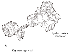 Снимите замок зажигания (А) и отсоедините разъем системы предупреждения о ключе/иммобилайзера.