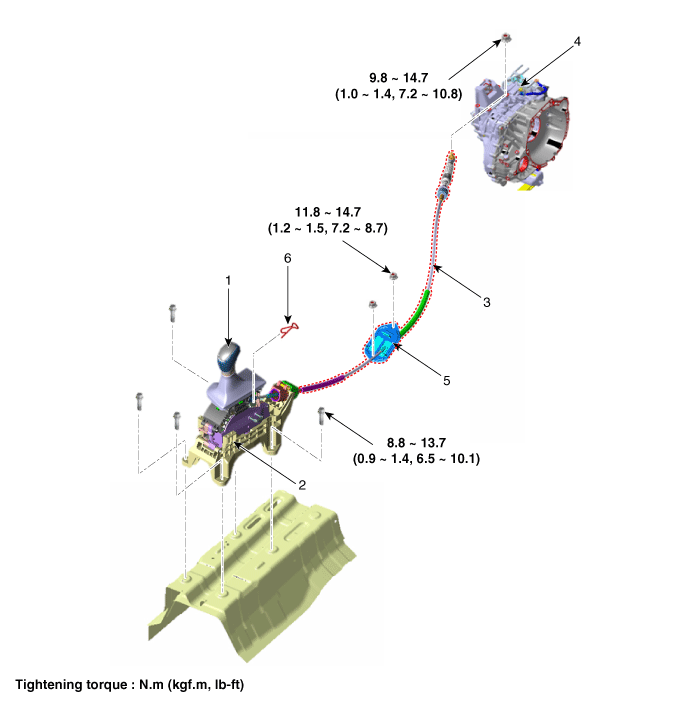 Hyundai Elantra: Автоматическая система управления коробкой передач / Компоненты троса переключения передач и расположение компонентов