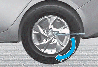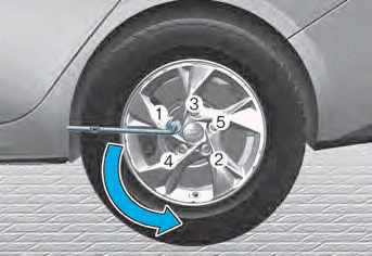 13. С помощью ключа для колесных гаек затяните гайки в порядке показано. Дважды проверьте каждую гайку пока они не натянуты. После изменения шины, имеют авторизованный HYUNDAI дилер затяните зажимные гайки правильный крутящий момент как можно скорее.