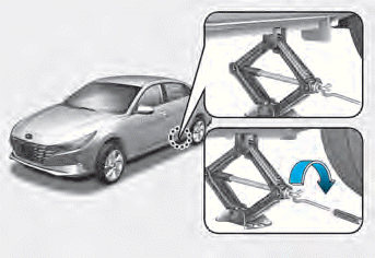8. Вставьте ручку домкрата в домкрат. и поверните его по часовой стрелке, подняв автомобиль, пока шина не оторвется от земли. Убедитесь, что автомобиль устойчив на Джек.