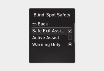 При включенном двигателе выберите «Водитель Помощь → Безопасность в слепых зонах → Безопасный выход Assist (SEA)’ из меню настроек, чтобы включите предупреждение о безопасном выходе и снимите флажок, чтобы отключить функцию.