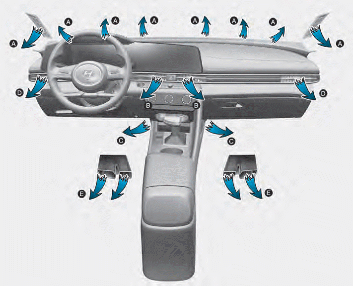 Вентиляционный поток приборной панели может быть вверх/вниз или влево/вправо с помощью рычаг регулировки вентиляции.