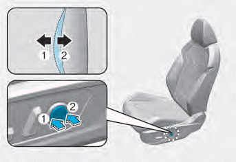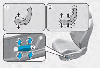 Поясничную опору можно регулировать нажатием переключателя поясничной опоры. Нажмите на переднюю часть переключателя (1) для увеличения поддержки или задней части переключатель (2) для уменьшения поддержки.