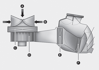 [A] : Наружный воздух, [B] : Рециркуляционный воздух [C] : Воздушный фильтр салона, [D] : Вентилятор [E] : Сердцевина испарителя, [F] : Сердцевина нагревателя