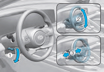 2. Отрегулируйте рулевое колесо по желаемый угол (2) и расстояние вперед/назад (3).