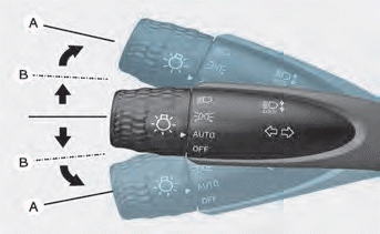 Чтобы подать сигнал поворота, нажмите на рычаг для левого поворота или вверх для правого поворота в положение (А). Чтобы подать сигнал о смене полосы движения, немного переместите рычаг указателя поворота и удерживайте его в положении (B). Рычаг будет вернуться в положение OFF при отпускании или когда поворот завершен.