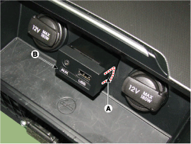 Снимите мультимедийный разъем (B) с напольной консоли, освободив фиксированные крючки (A).