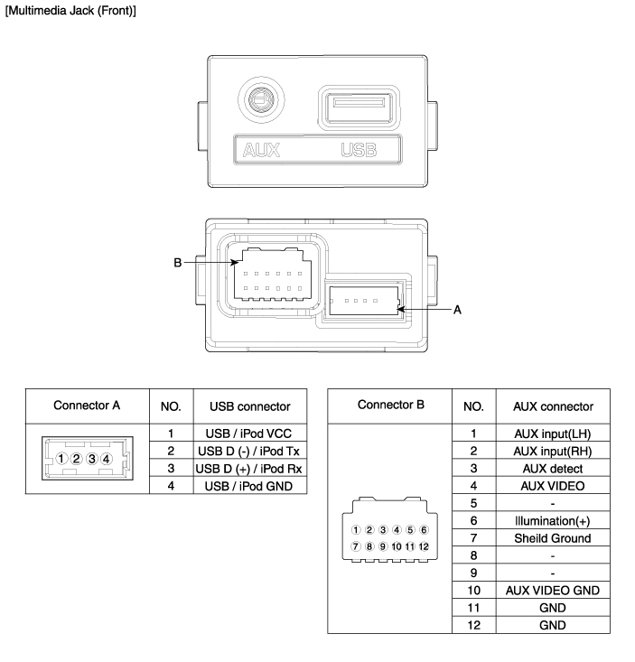 Hyundai Genesis: схематические схемы системы AVN / разъема AUX