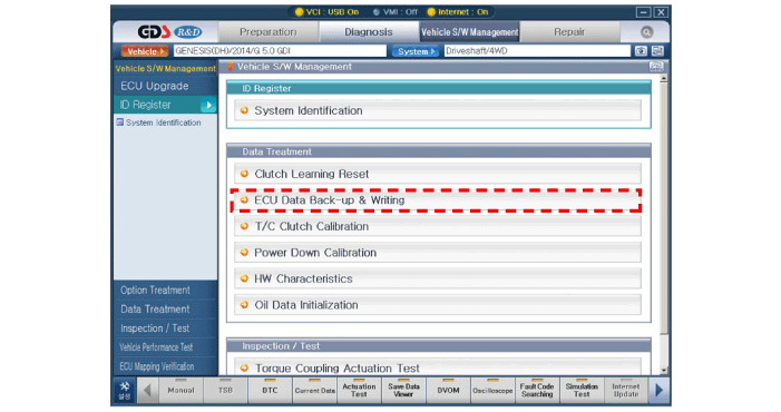 Чтобы записать данные раздаточной коробки в новый ITA, выберите услугу «Резервное копирование и запись данных ECU» GDS.