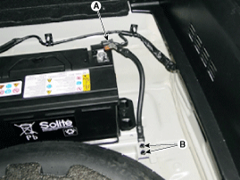 Отсоедините отрицательный (-) кабель аккумуляторной батареи, отвернув болты (B).
