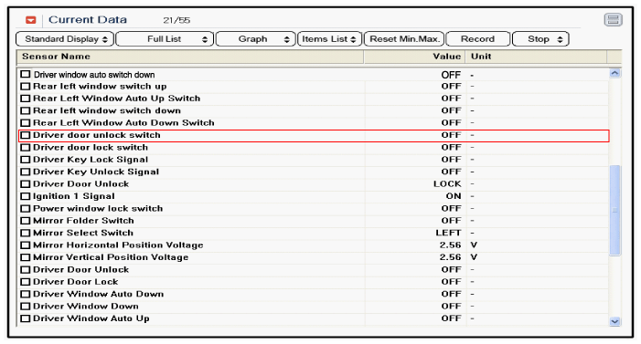 Можно проверить входные/выходные данные для датчиков, соответствующих модулю сиденья водителя или двери помощника (DDM/ADM).