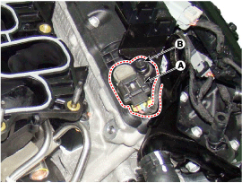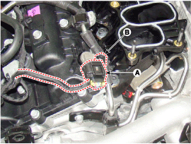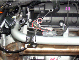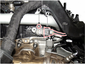 Выверните установочный болт (В) и снимите датчик с головки блока цилиндров вертикально.