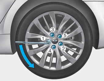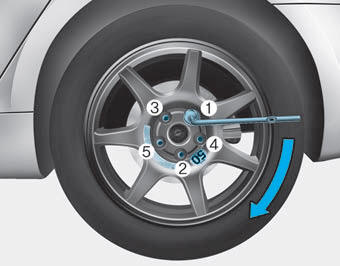 14. С помощью ключа для колесных гаек затяните гайки в порядке показано. Дважды проверьте каждый выступ гайки, пока они не будут затянуты. После замена шин, рекомендуем что авторизованный HYUNDAI дилер затяните зажимные гайки правильный крутящий момент как можно скорее.