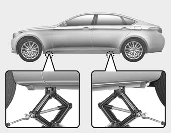 8. Установите домкрат в указанном месте. положение домкрата под рамой ближайший к шине, которую вы меняете. Положения домкрата пластины, приваренные к раме двумя вкладки и выпуклая точка. Никогда не домкрат любая другая позиция или часть транспортное средство. Это может повредить сторону литье под уплотнение.