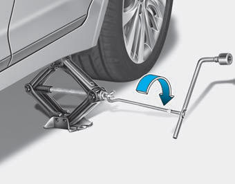 9. Вставьте ручку домкрата в домкрат. и поверните его по часовой стрелке, подняв автомобиля до тех пор, пока шина не преодолеет земля. Убедитесь, что автомобиль стабильно на домкрате.