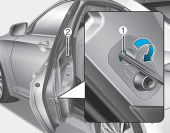 Блокировка от детей находится на края каждой задней двери. Когда замок от детей в замке (1) положение, задняя дверь не откроется, если внутренняя ручка двери (2) потянута.