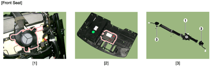 Удаление Переднее сиденье 1. Отсоедините клеммы (-) аккумулятора. 2. Снимите верхнюю крышку напольной консоли. (См. Кузов — «Узел напольной консоли») 3. Отсоедините разъем и винт и р ...