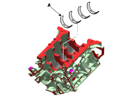 Установите 2 упорных подшипника (А) под шейку № 3 блока цилиндров так, чтобы масляные канавки были обращены наружу.