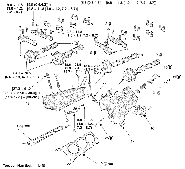 11. Левый впускной распределительный вал CVVT в сборе 12. Левый выпускной распределительный вал CVVT в сборе 13. Правый выпускной распредвал OCV 14. Левый впускной распределительный вал OCV 15. Правая головка блока цилиндров 16. Кронштейн топливного насоса 17. Левая головка блока цилиндров |