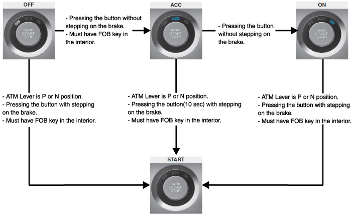 Состояние электропитания изменяется в диапазоне ВЫКЛ. >ACC>IGN>OFF нажатием кнопки без нажатия на тормоз (Или с нажатием на тормоз) внутри автомобиля с ключом FOB (Когда передача не находится в положении P, мощность постоянно переключается между ACC и IGN. Преобразование в OFF невозможно.)