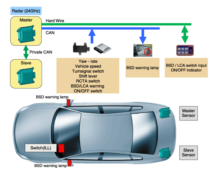 BSD — это система, которая измеряет скорость и расстояние от следующие транспортные средства с помощью двух прикрепленных радарных датчиков магнитных волн к заднему бамперу и обнаруживает любое транспортное средство в слепой зоне и подает сигнал тревоги (визуальный и слуховой).