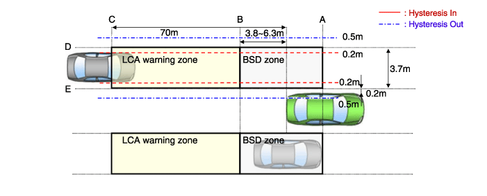 Обнаружение слепых зон (BSD): обнаруживает другие транспортные средства в зоне BSD и включает сигнальную лампу BSD для водителя.