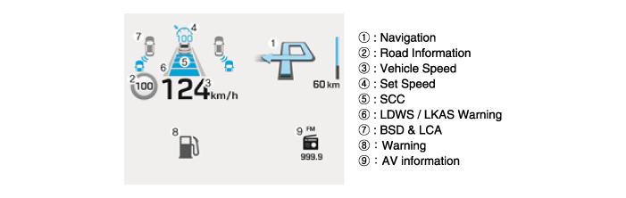 Сигнальная лампа, спидометр, интеллектуальный круиз-контроль (SCC), пошаговая навигация, LDWS, BSD и LCA