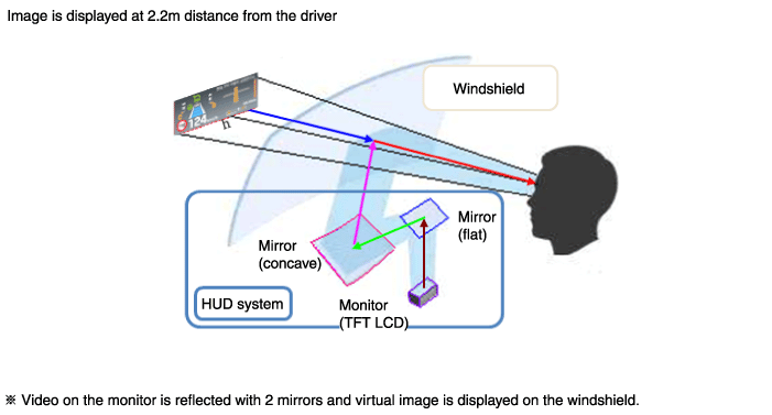 Проекционный дисплей отображает изображения TFT LCD на два зеркала (плоские/вогнутые) и отображает их на расстоянии 2,2 м от места водителя. глаз.