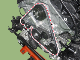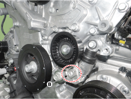 Поверните натяжитель (В) по часовой стрелке и ослабьте его, затем снимите приводной ремень (А).