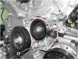 Снимите автоматический натяжитель приводного ремня (А).