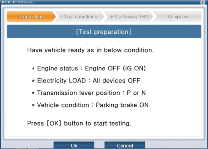 Выберите «Управление программным обеспечением автомобиля» > «Проверка/тестирование» > «Тест производительности ETC» в меню GDS.