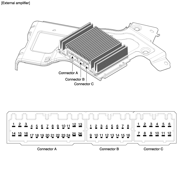 Удаление 1. Отсоедините отрицательную (-) клемму аккумуляторной батареи. 2. Откройте багажник, снимите левую обшивку багажника. (См. Кузов — «Отделка багажника») 3. Снимите внешний усилитель (C) после отсоединения ...