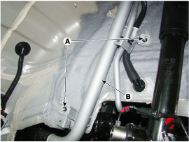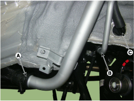 Снимите узел заливной горловины (В) с автомобиля, отвернув гайки крепления кронштейна (А).