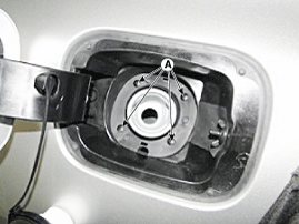 Снимите крепежные винты заливной горловины (А) после открытия лючка топливного бака.